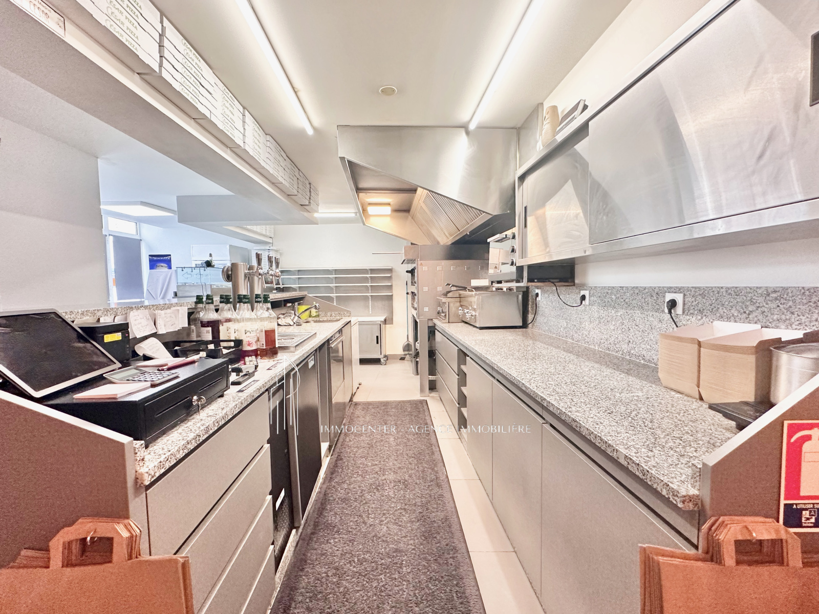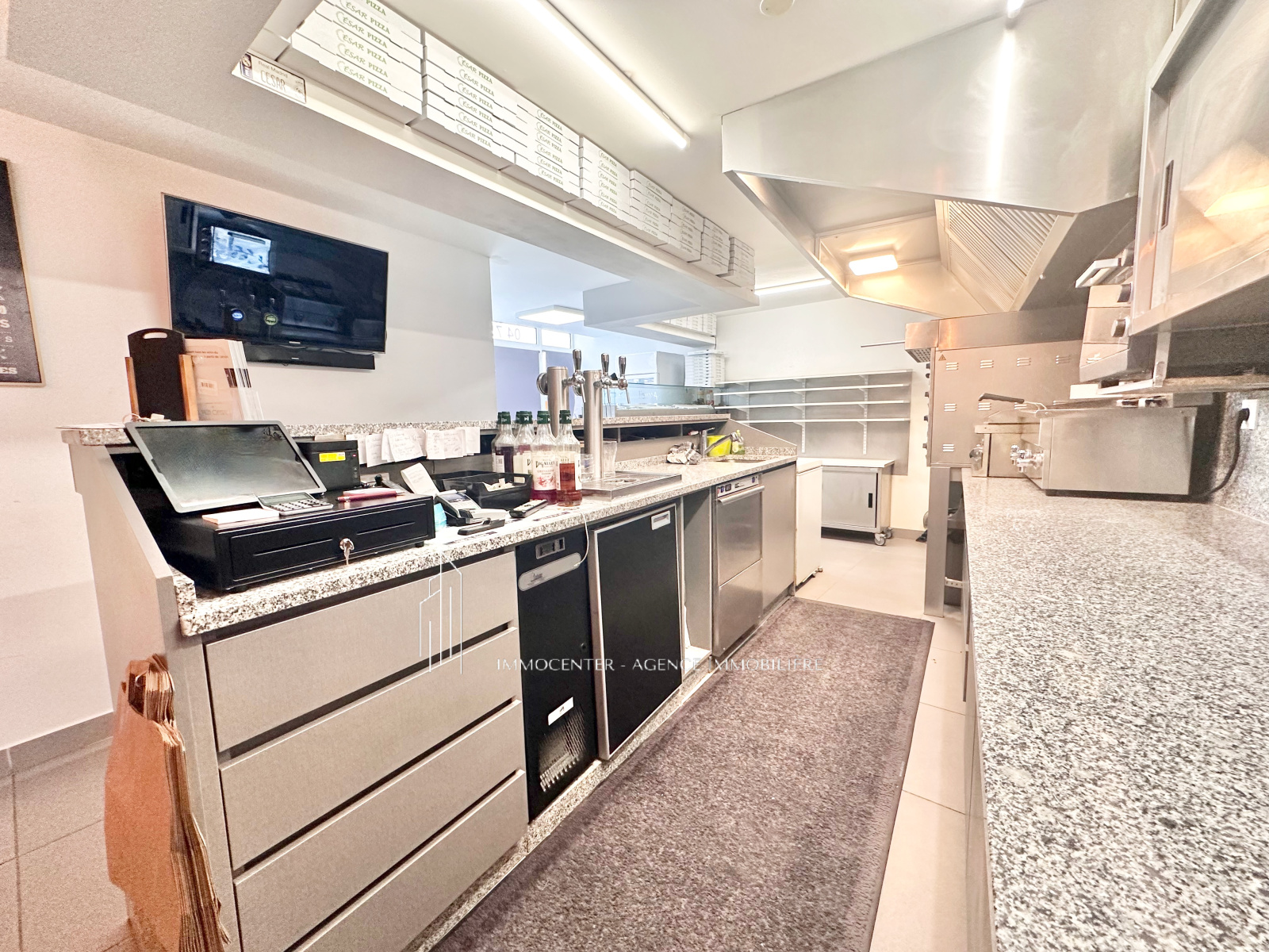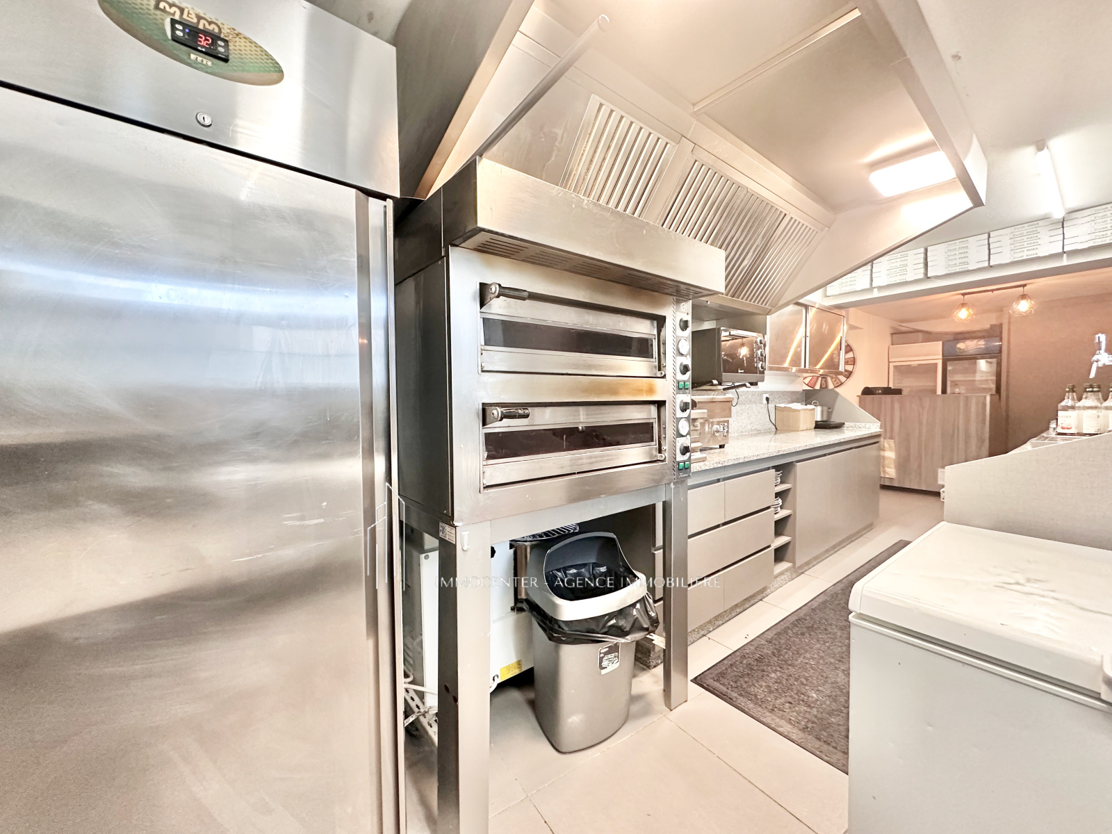 Materiels restants : tour refrigérée / saladettes, armoire réfrigérée, grill, double four à pizza Cappone, Hotte avec evacuation extérieure, double fritteuse, four électrique, lave vaisselle, thermo-formeuse, pétrin, 2 congélateurs, 3 télévisions, 1 réfrigérateur boisson./ Matériel en location: machine à bière, 2 réfrigérateurs à boissons, caisse enregistreuse.