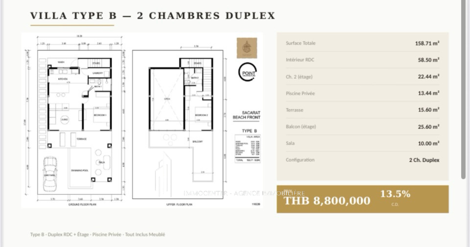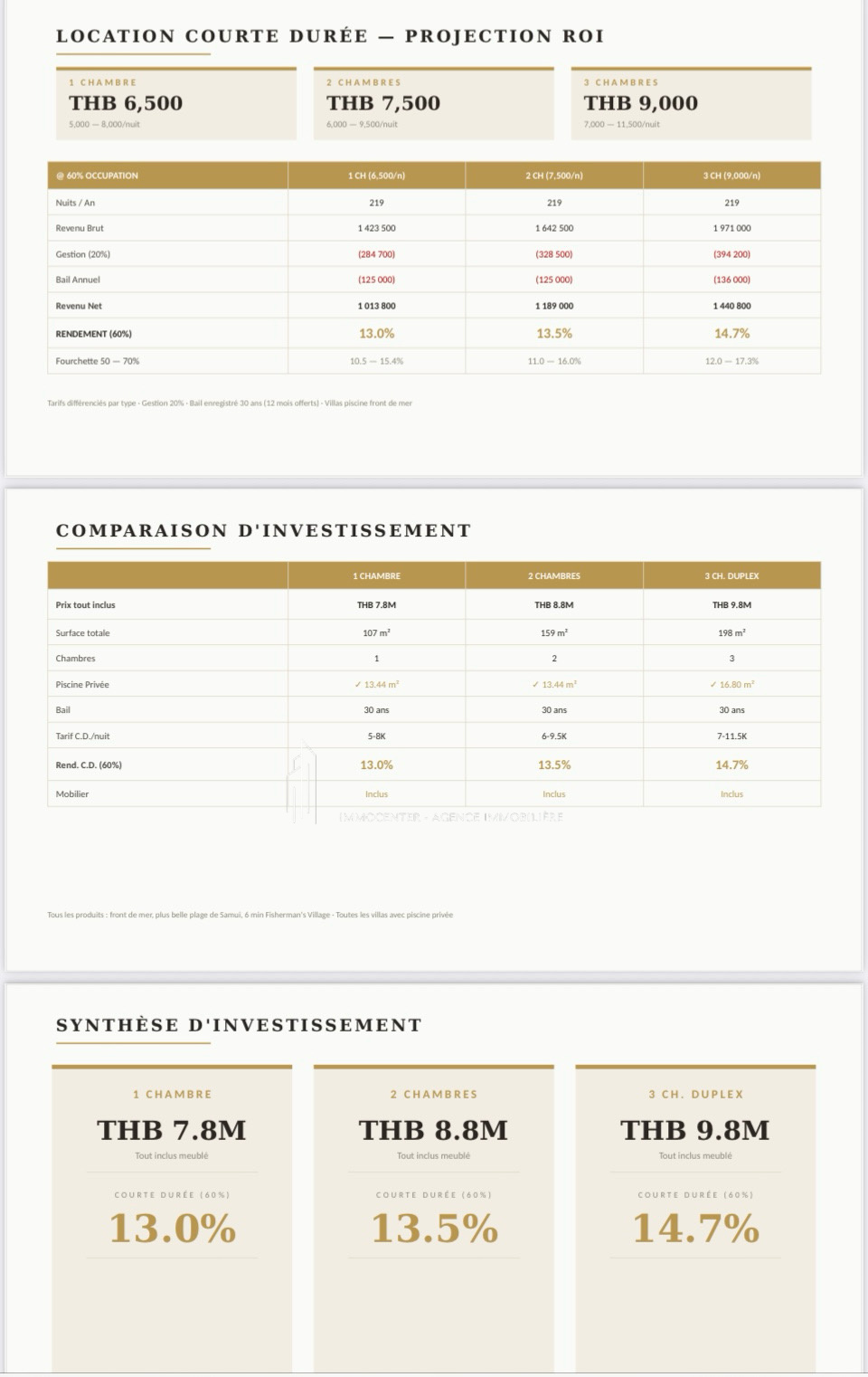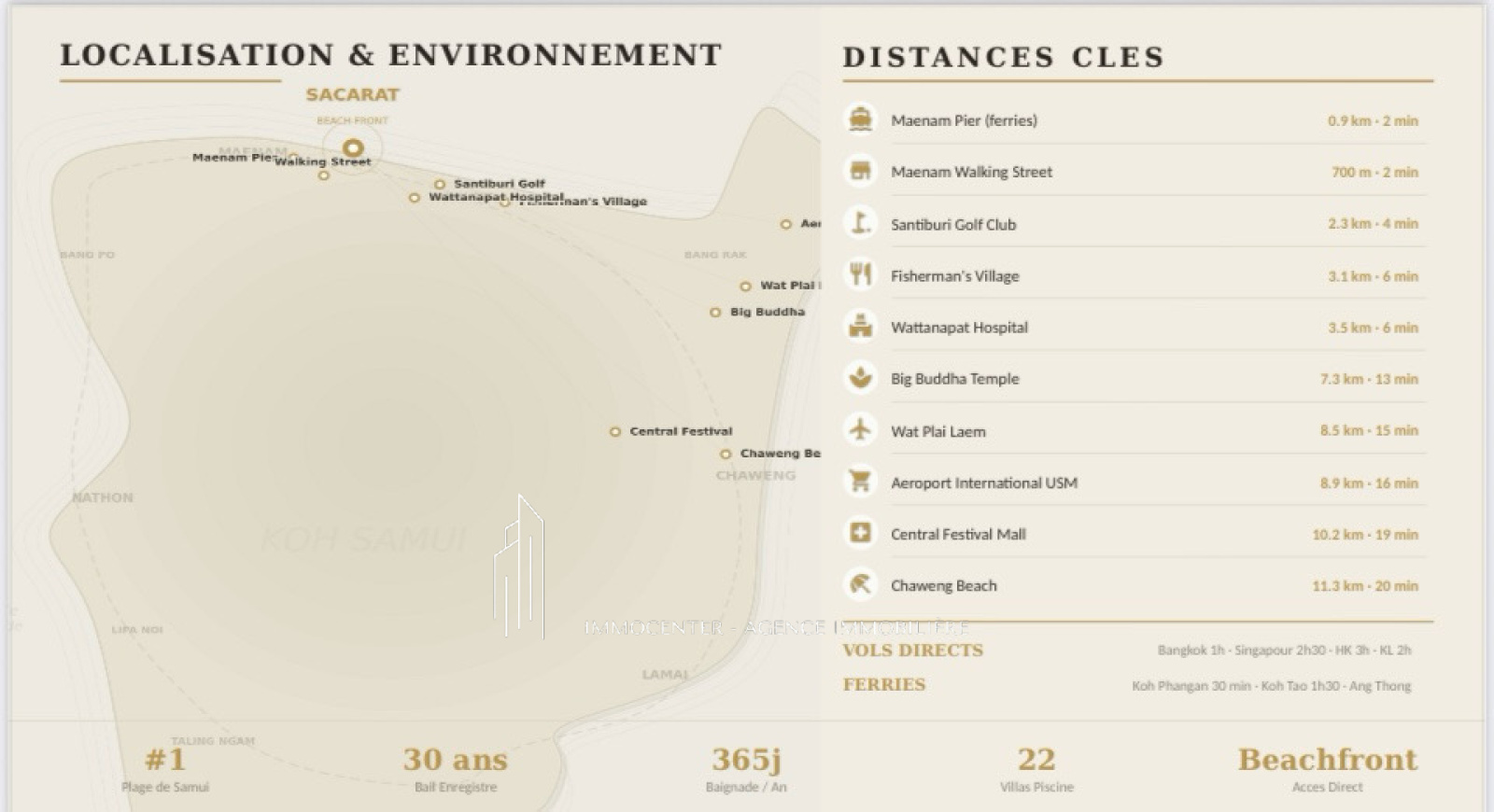 Villa Maenam Beach special investisseur. leashold de 30 ans. – Villa de luxe en bord de mer à Koh Samui Immocenter vous propose un projet immobilier exceptionnel situé à Maenam, directement en bord de mer, sur l’une des plus belles plages de Koh Samui. La résidence est implantée à seulement 50 mètres de la plage, avec une vue directe sur Koh Phangan et une exposition sud-est, idéale pour profiter du soleil et de la mer toute l’année. Villa 1 chambre – Spécial investissement Surface habitable : 107 m² Composition : • 1 suite parentale • Double salon • Cuisine équipée • Buanderie • Piscine privée • Terrasse • Garage couvert • Vendue entièrement meublée Situation exceptionnelle directement sur la plage. Produit idéal pour la location saisonnière avec une rentabilité estimée à minimum 13 %. Prix : 7 800 000 bahts Soit environ 210 000 € Autres typologies disponibles dans le projet • Villas 2 chambres à partir de 8 800 000 bahts • Villas 3 chambres à partir de 9 800 000 bahts. Projet rare en première ligne mer à Maenam, parfaitement adapté : • Investissement locatif • Résidence secondaire • Projet patrimonial en Thaïlande Emplacement privilégié à Koh Samui, secteur calme et recherché, face à Koh Phangan, accès direct à la plage. Pour plus d’informations, plans, disponibilité ou visite : Immocenter www.agence-immocenter.com Immocenter +33 6 24 90 51 34