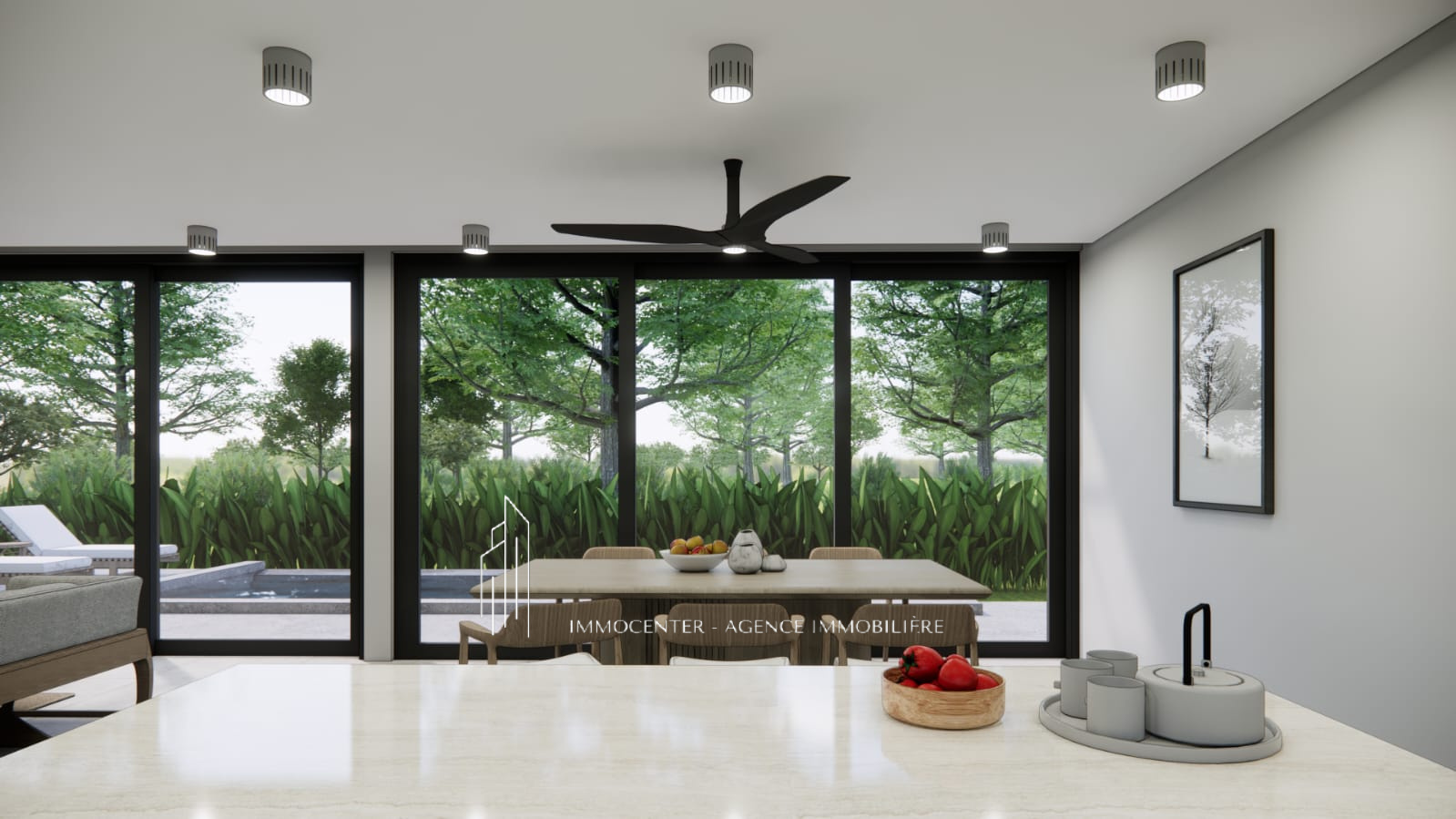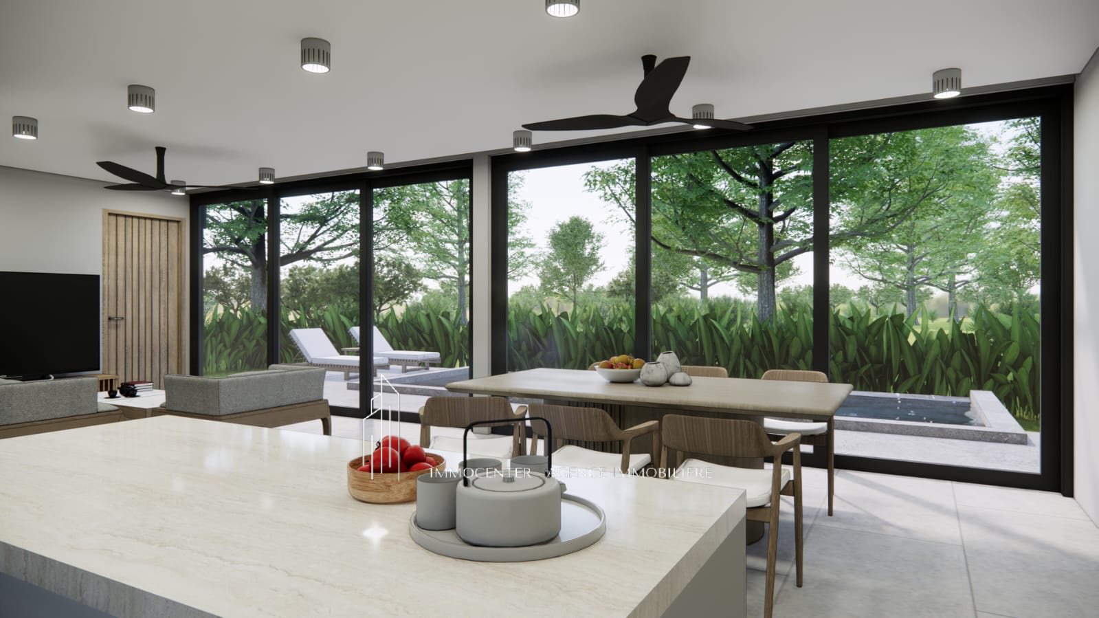 • Grande pièce à vivre lumineuse avec salon et salle à manger ouverts sur la piscine